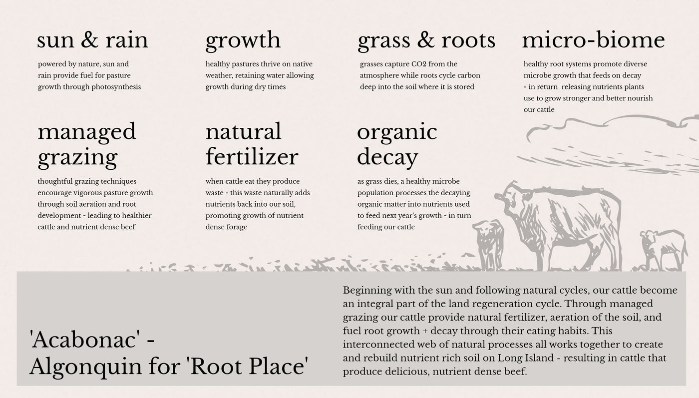Acabonac is an Algonquin word that is very familiar to our hometown of East Hampton, NY. It translates to ‘root place’ and so we thought it was fitting. A place where roots are grown… Acabonac is spelled a number of different ways, most frequently today as ‘Accabonac’. However, old Algonquin texts present the spelling in a number of different ways, including: Accabonac, Acabonac, Accabonuck, Accombommok, Accombomok…. We like them all.